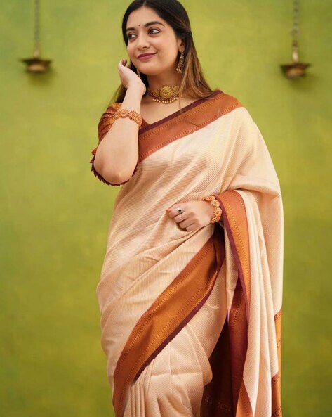 Banarasi Soft Silk Saree with Copper Zari Weaving & Silver Zari Striped Blouse