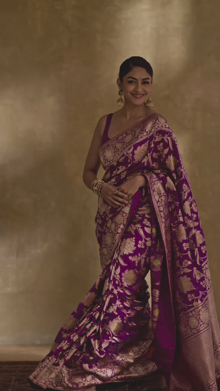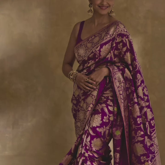 Crafted from premium Banarasi soft silk, this saree features exquisite gold zari weaving that reflects the richness of traditional craftsmanship. Its lustrous drape and intricate detailing make it a perfect choice for weddings, festive occasions, and cultural celebrations.