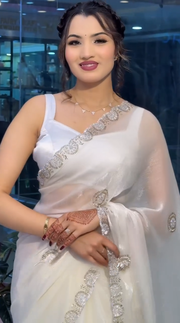 Elegant White Zarkan Work Fandy Sifforn Saree – Shakuntala Saree