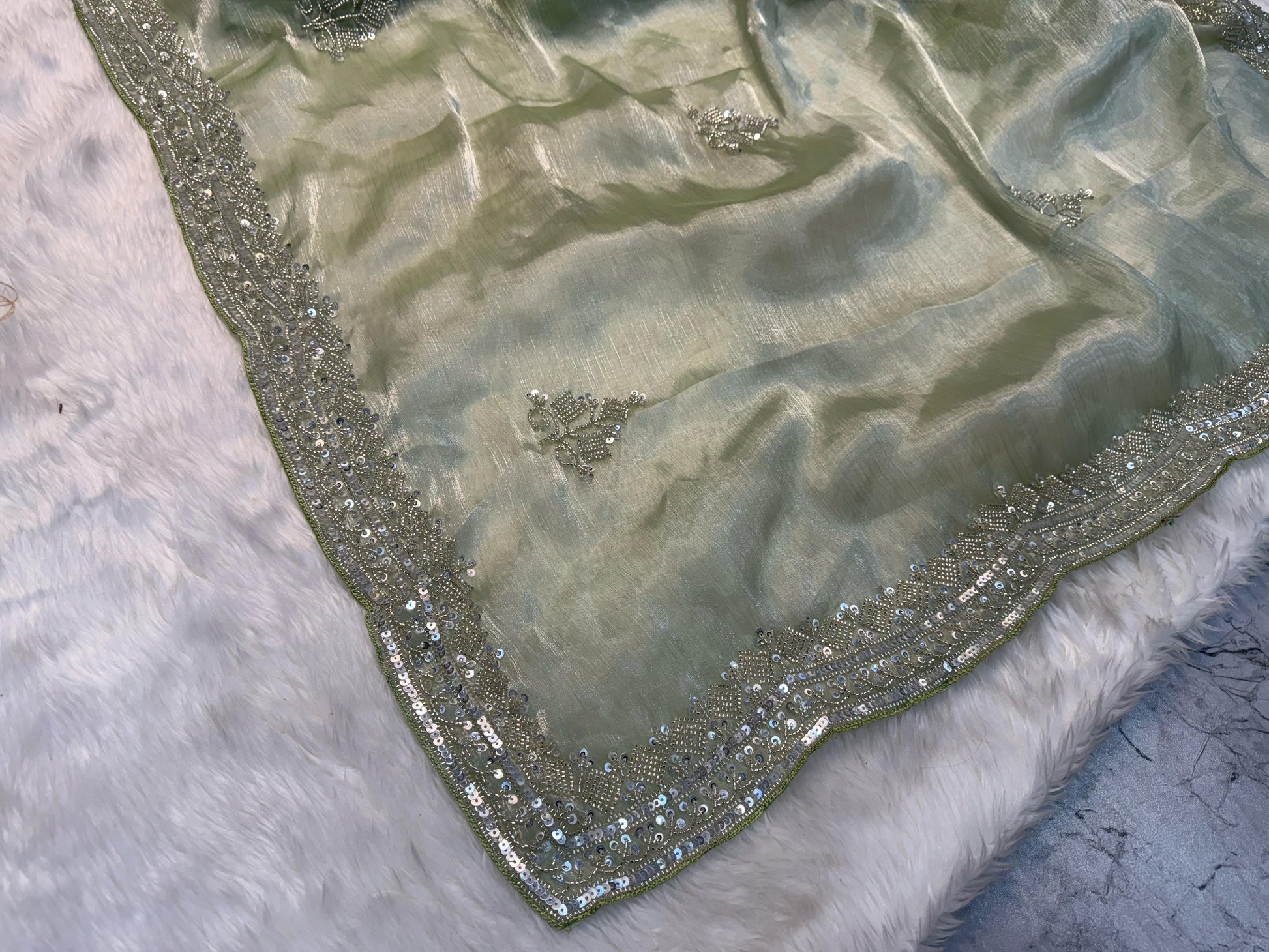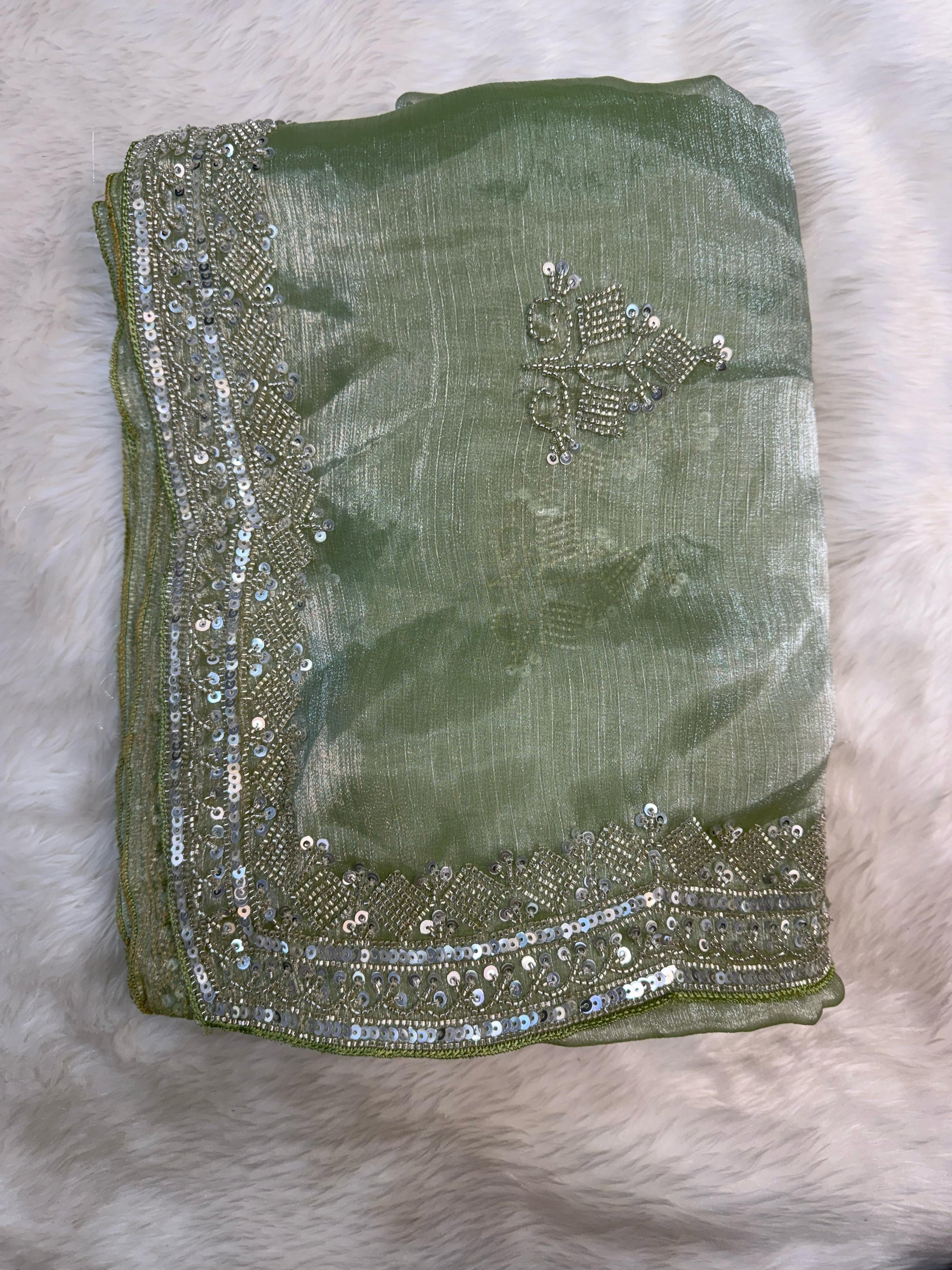 - Border: Hand-embroidered with shimmering accents