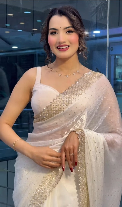Radiate sophistication with this stunning ivory Saree. Crafted for the modern woman who appreciates timeless elegance, this saree features shimmering sequin detailing and a rich golden Swarovski Zarkan Work border. A perfect blend of classic charm and contemporary glam, ideal for weddings, receptions, and special occasions.