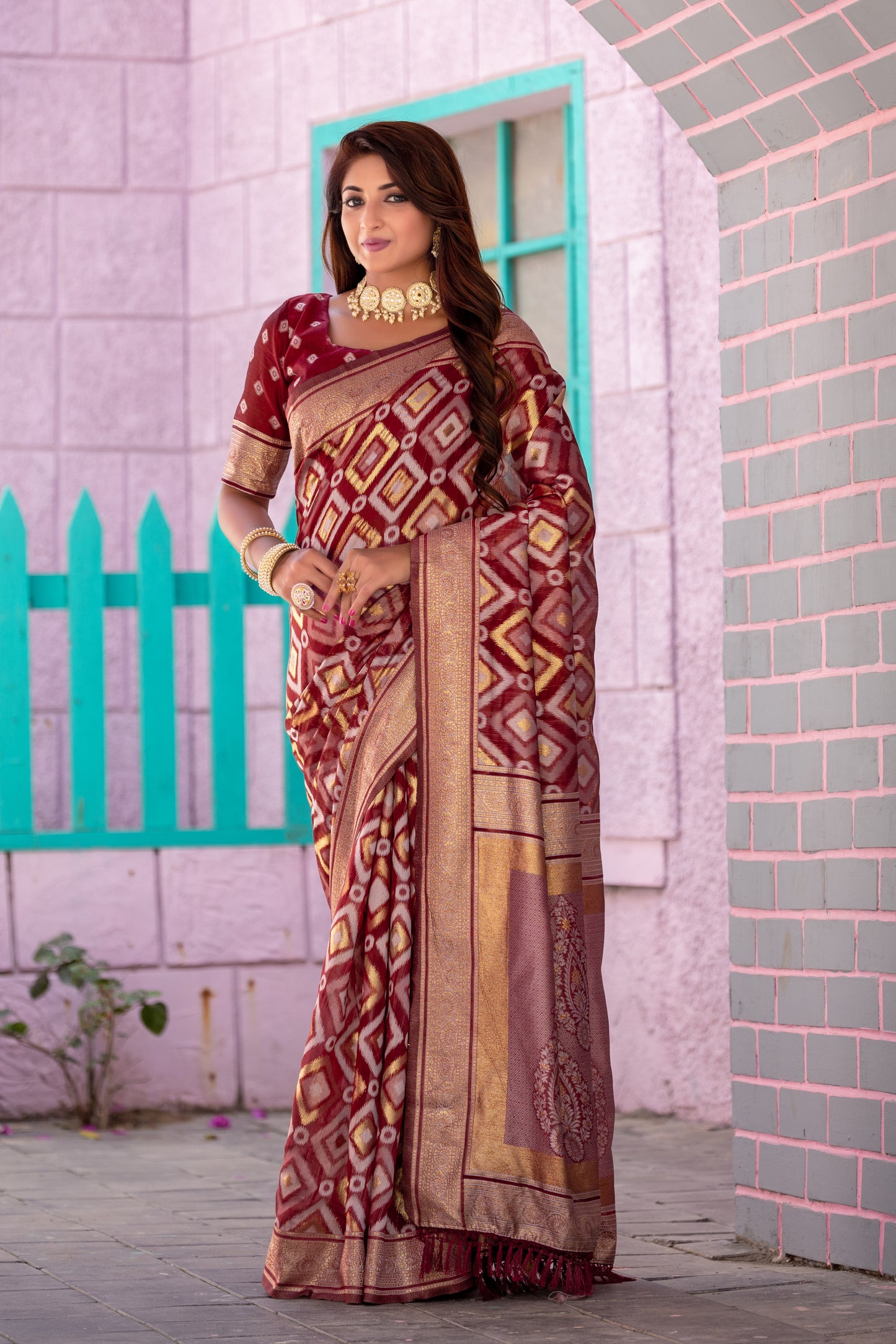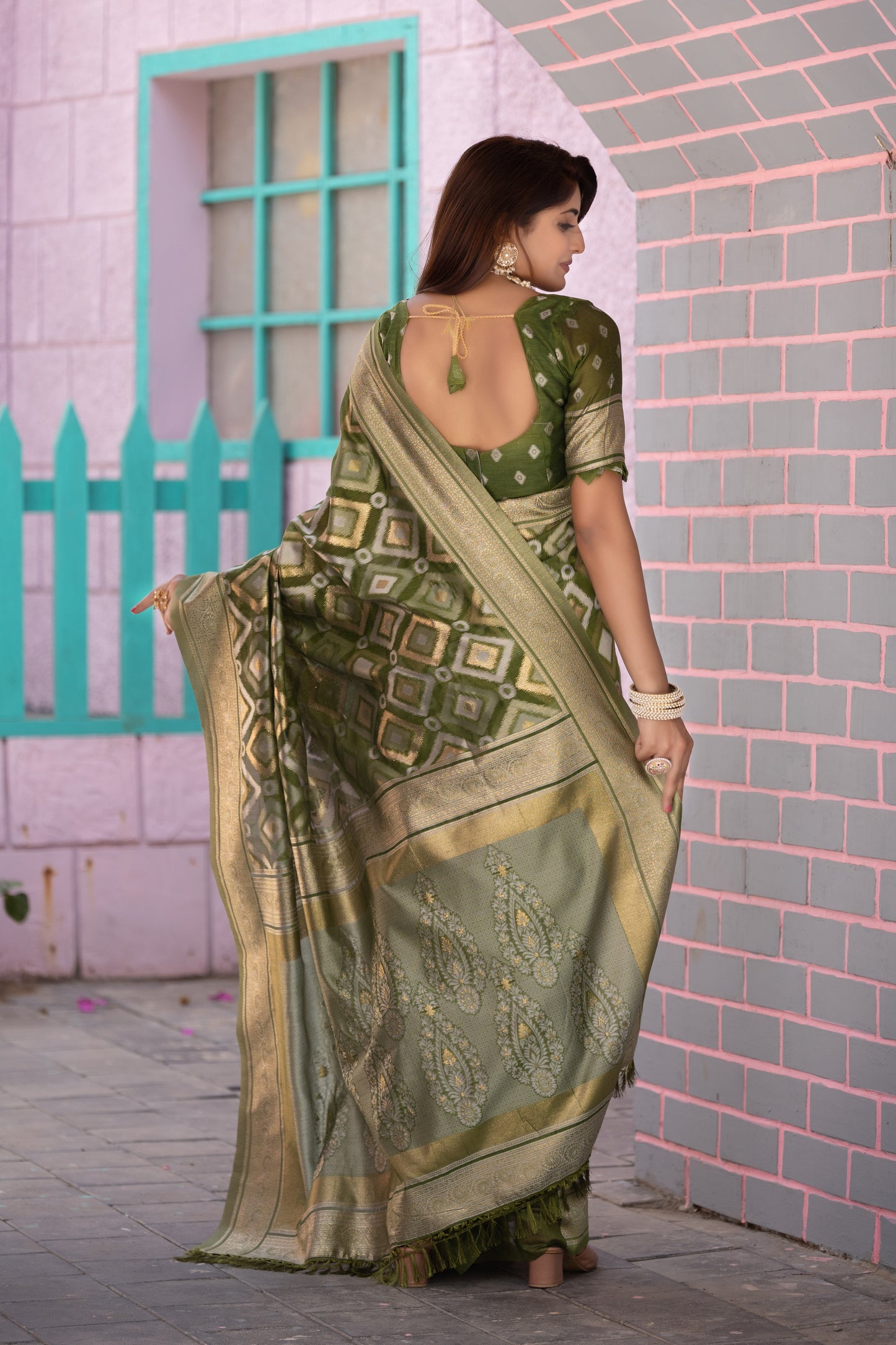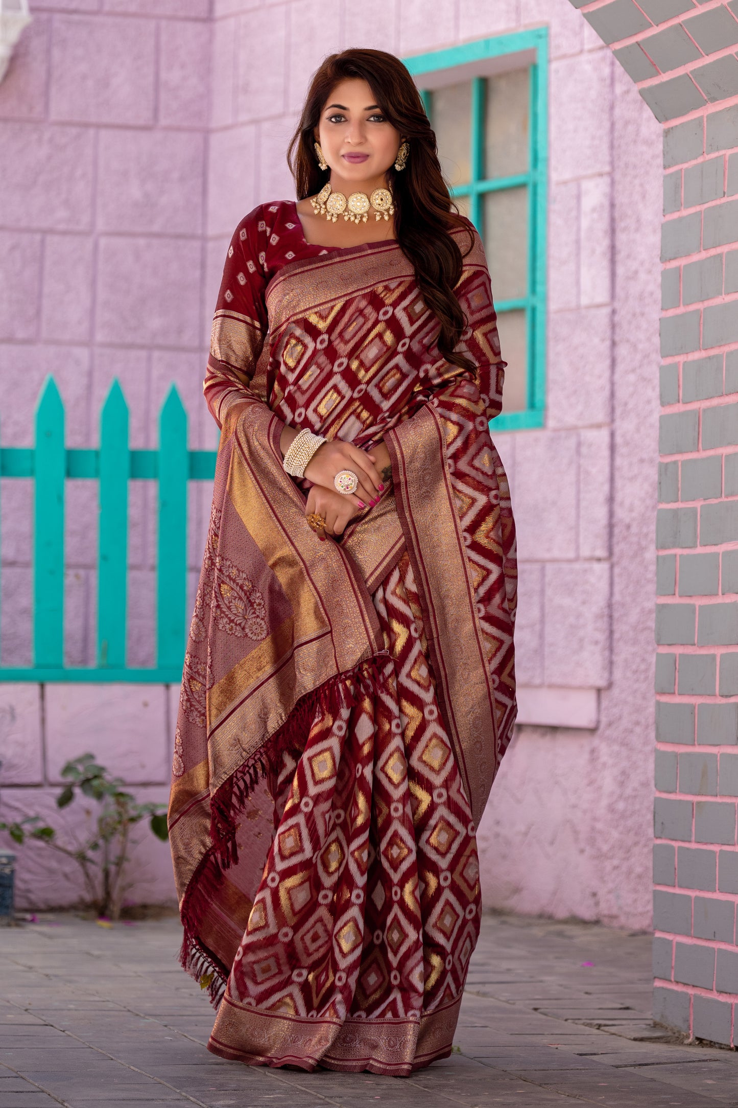 Radiate royal elegance with this luxurious Patola Silk Saree, crafted in a rich, vibrant shade and adorned with magnificent gold zari work. Featuring traditional diamond motifs and intricate detailing along the border and pallu, this saree offers the perfect fusion of timeless tradition and refined glamour. Ideal for weddings, festive celebrations, and grand occasions, it exudes grace and sophistication in every drape.
