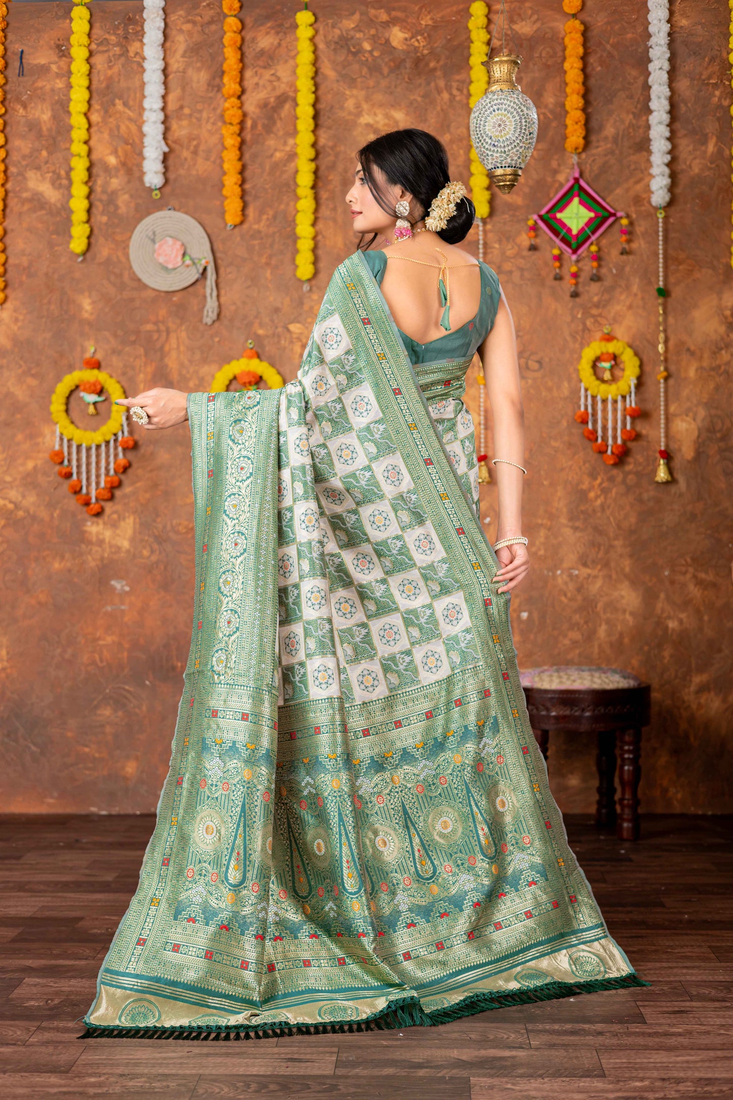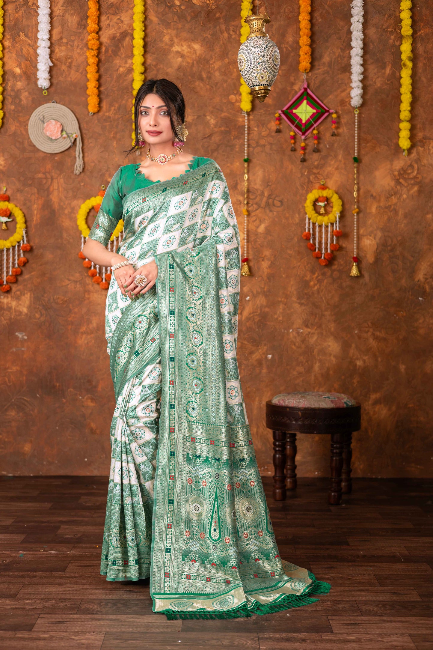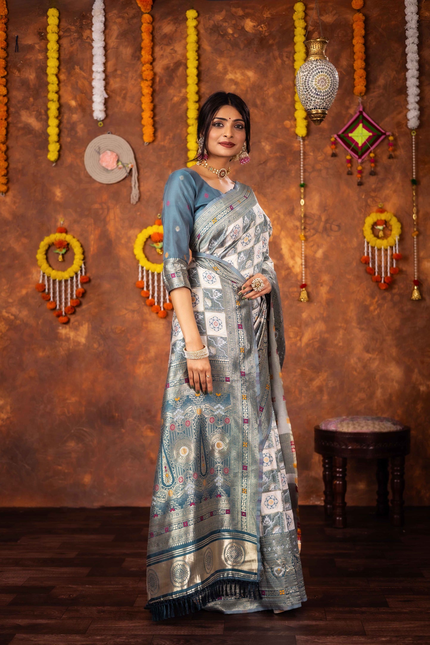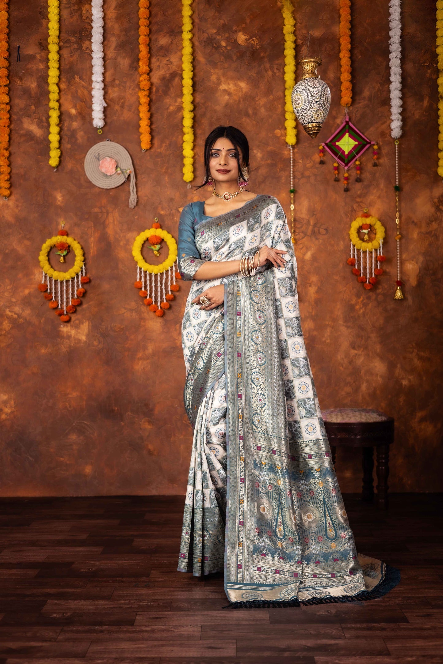 Step into timeless tradition with this exquisite Patola Silk Saree, beautifully woven with classic geometric and floral motifs. Featuring a harmonious blend of ivory, this saree brings together heritage aesthetics with refined craftsmanship, making it ideal for festive celebrations, weddings, and special cultural occasions.