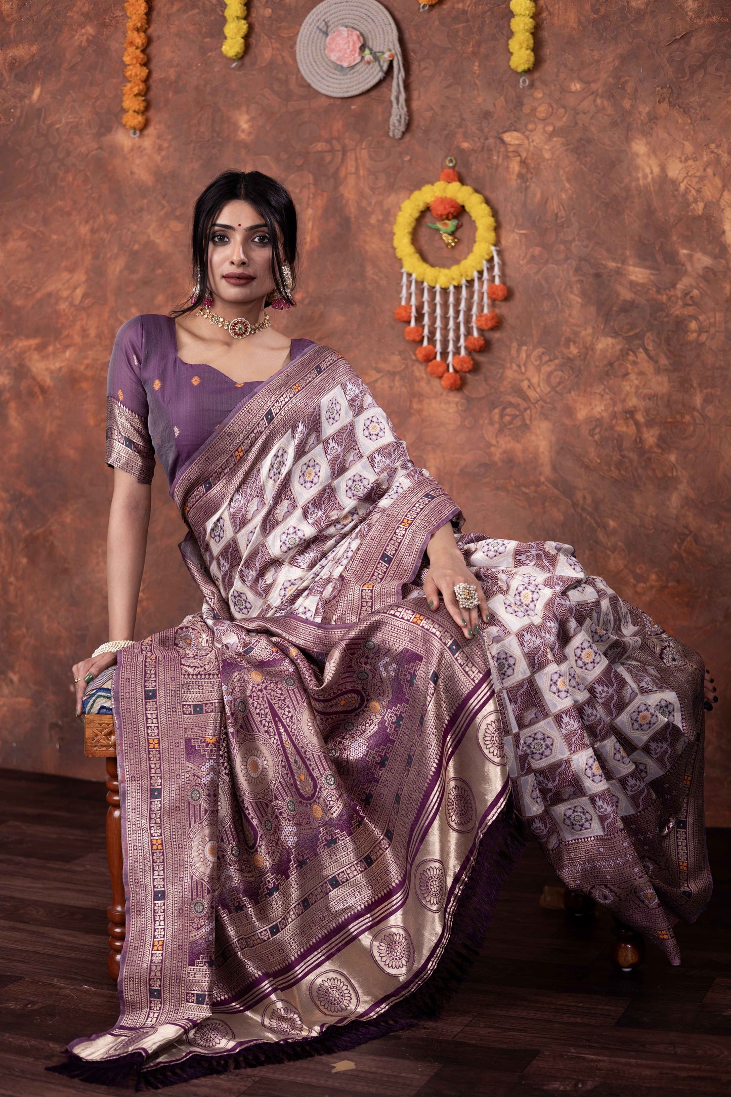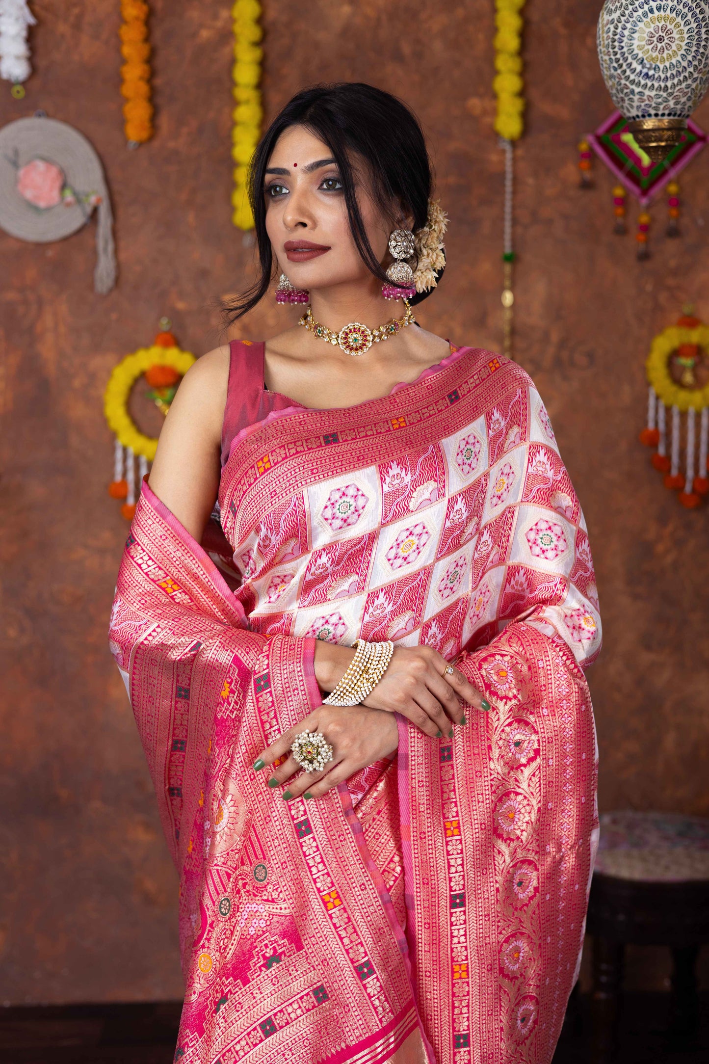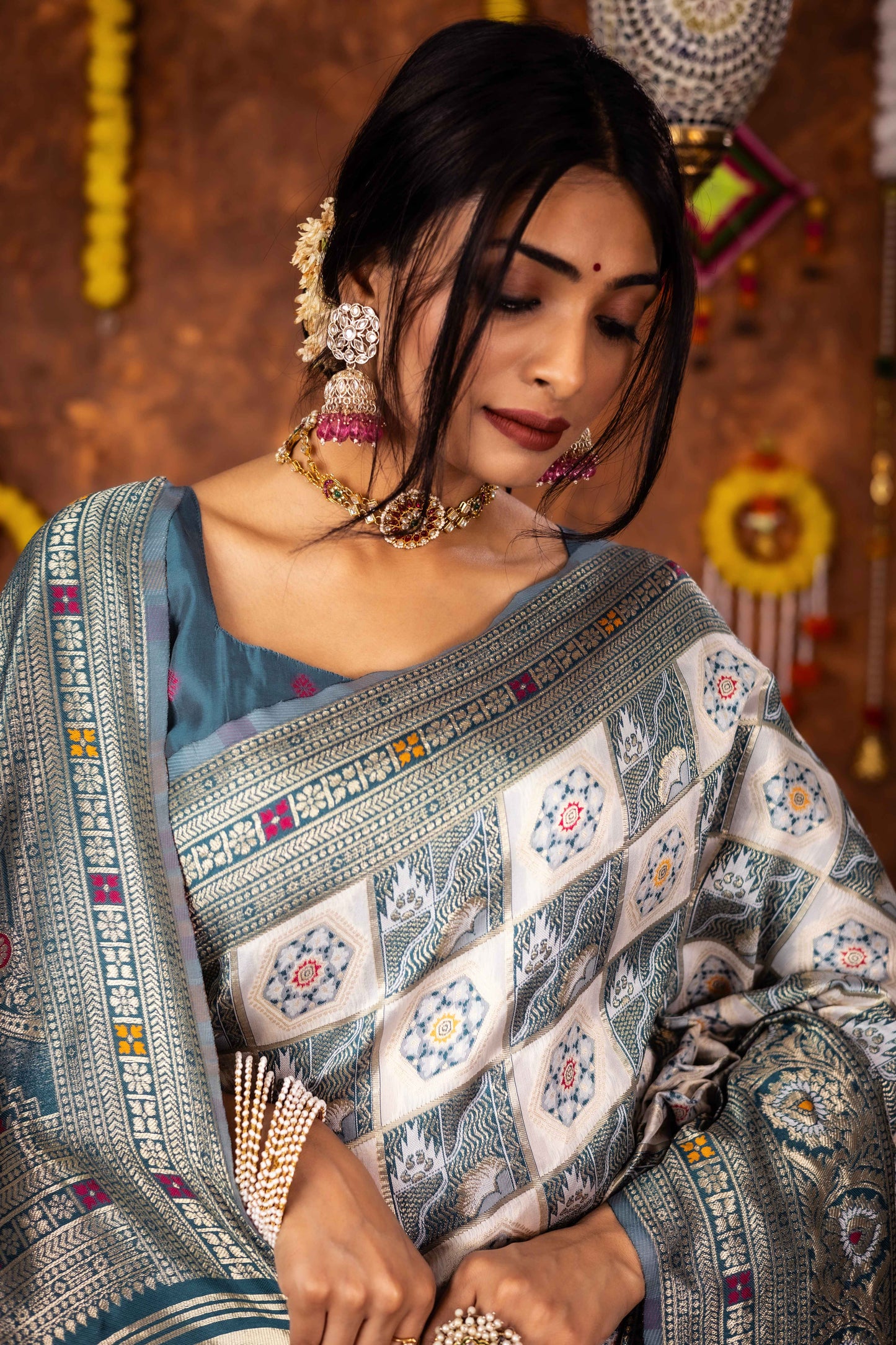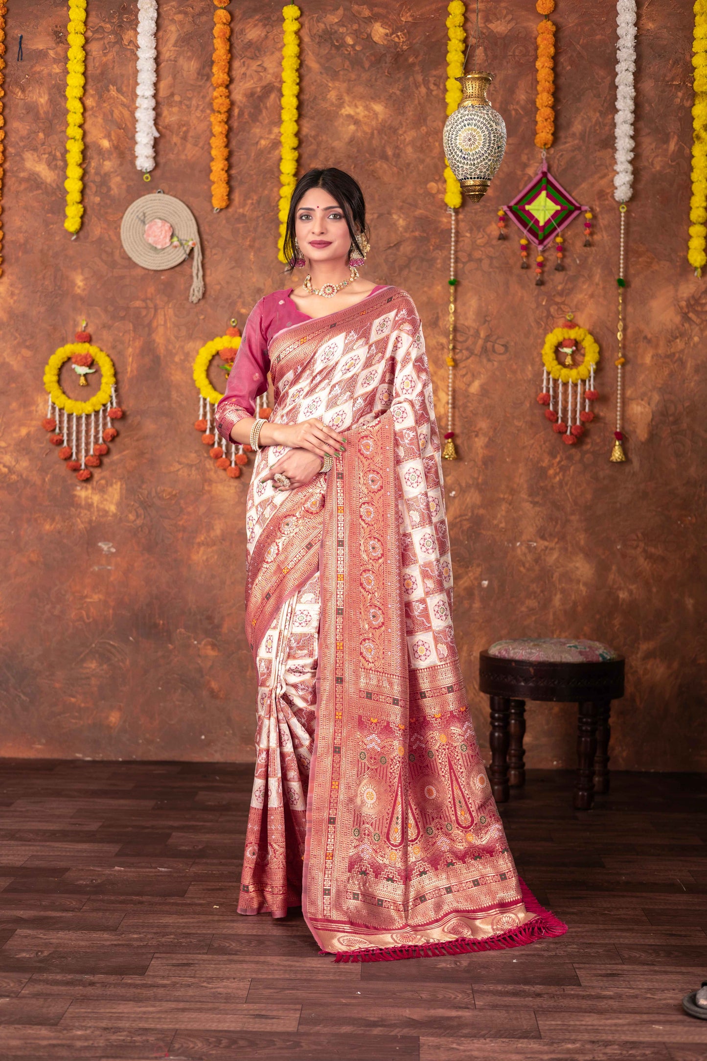 Step into timeless tradition with this exquisite Patola Silk Saree, beautifully woven with classic geometric and floral motifs. Featuring a harmonious blend of ivory, this saree brings together heritage aesthetics with refined craftsmanship, making it ideal for festive celebrations, weddings, and special cultural occasions.