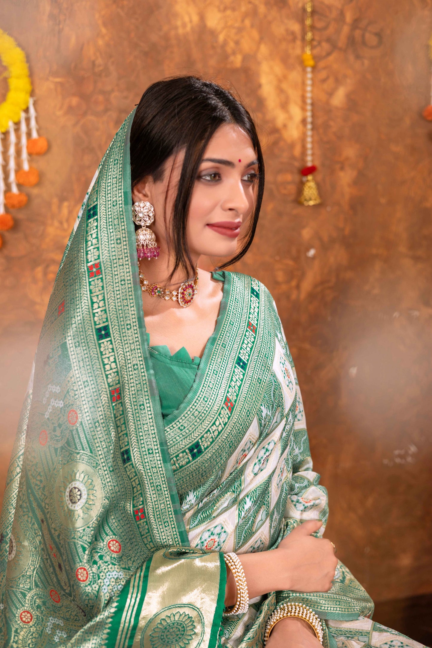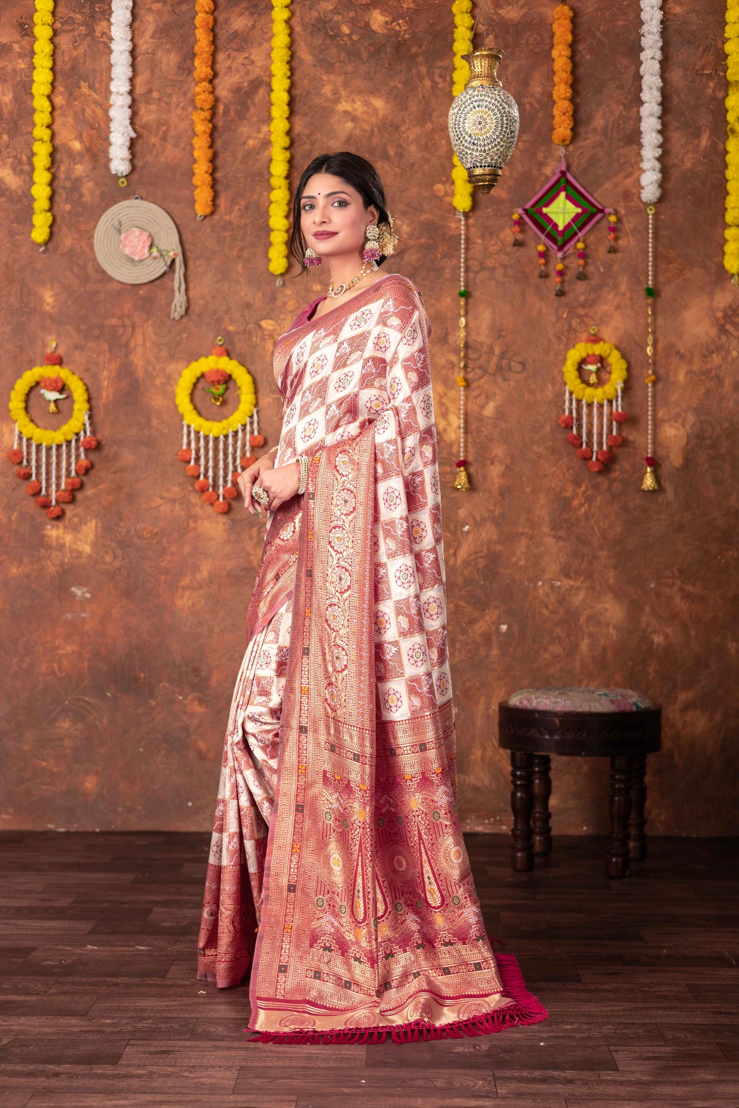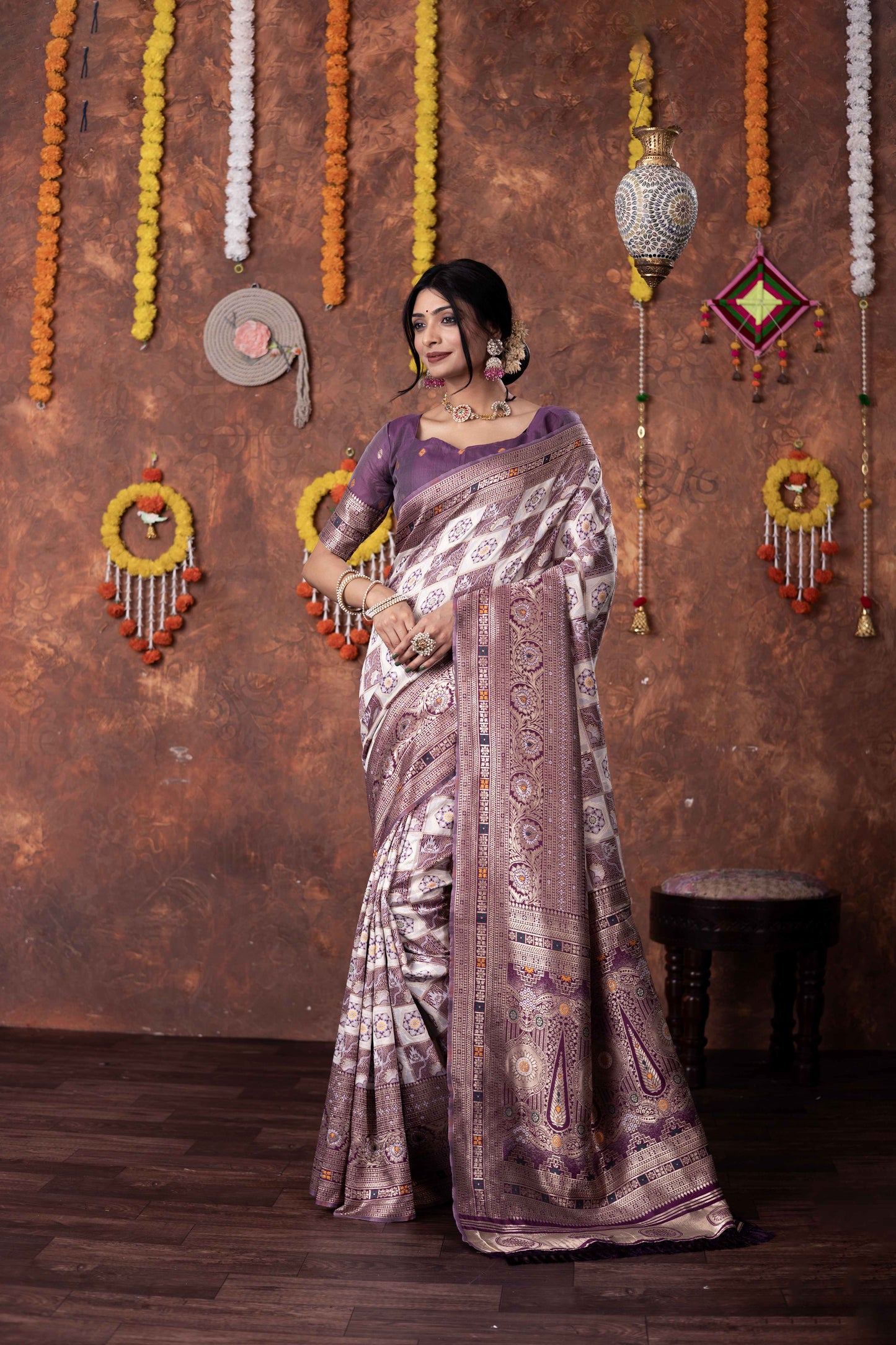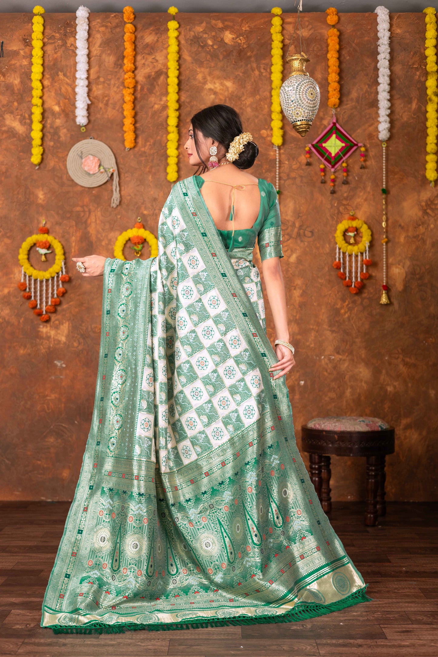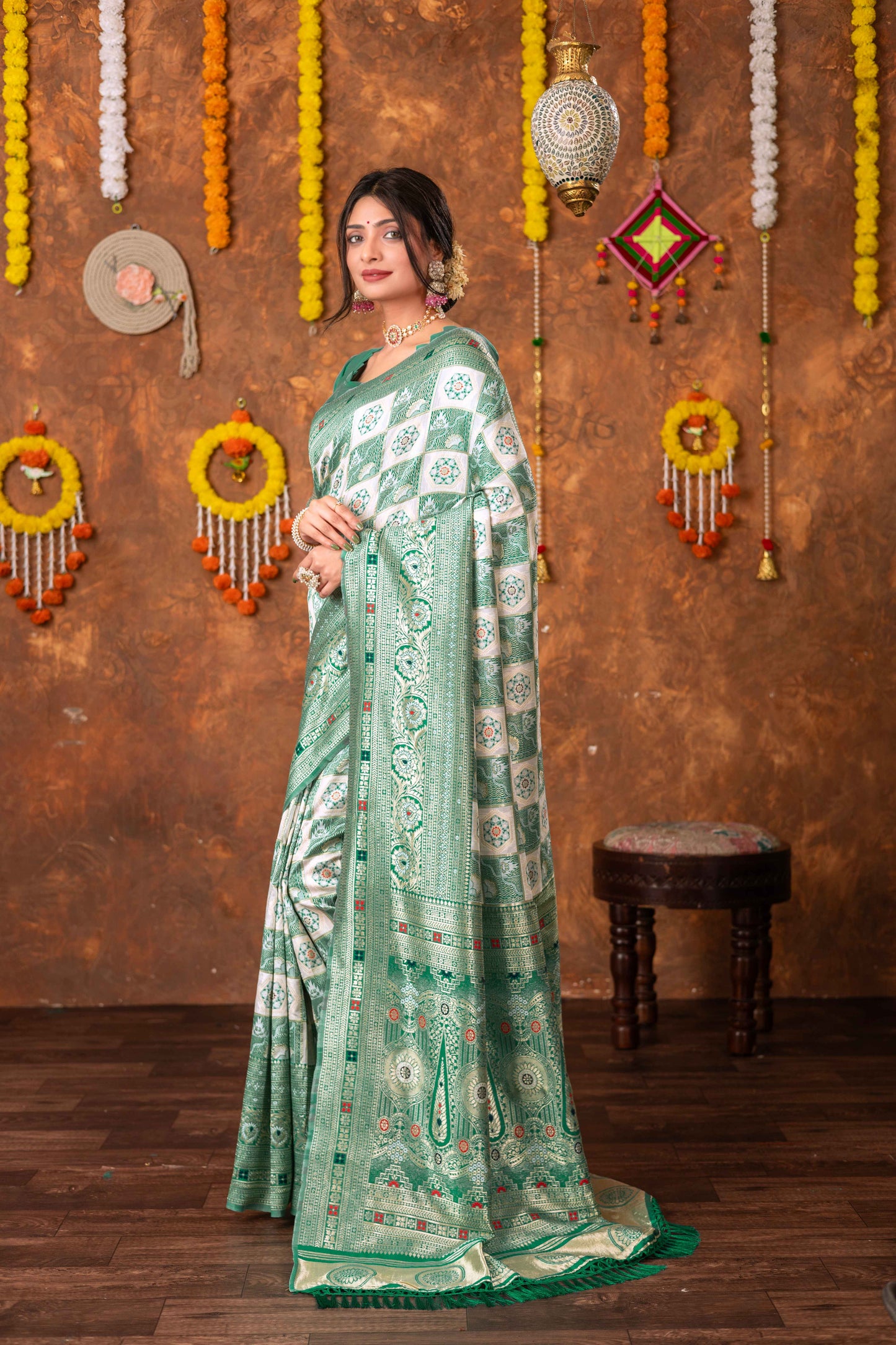 Step into timeless tradition with this exquisite Patola Silk Saree, beautifully woven with classic geometric and floral motifs. Featuring a harmonious blend of ivory, this saree brings together heritage aesthetics with refined craftsmanship, making it ideal for festive celebrations, weddings, and special cultural occasions.