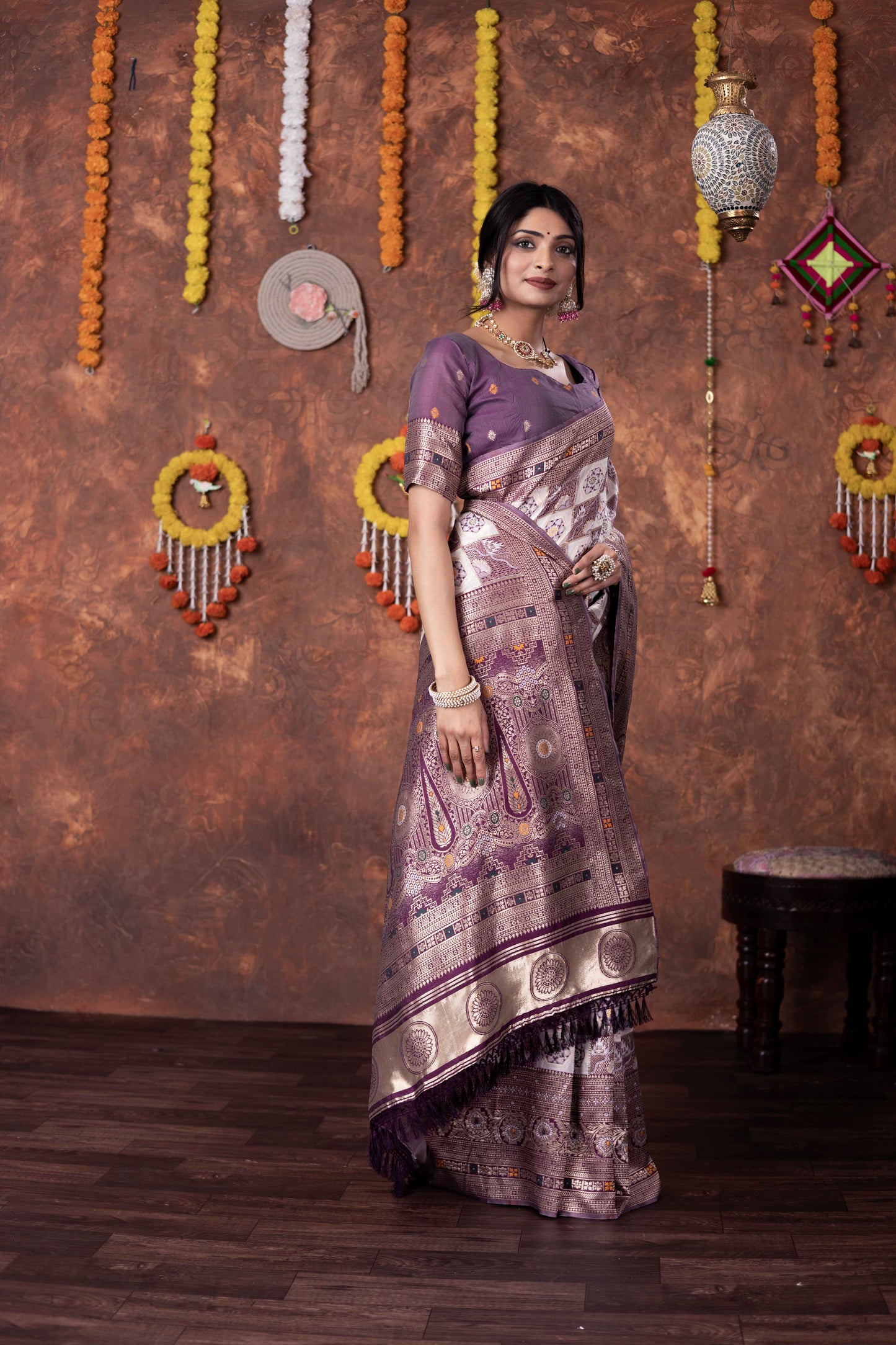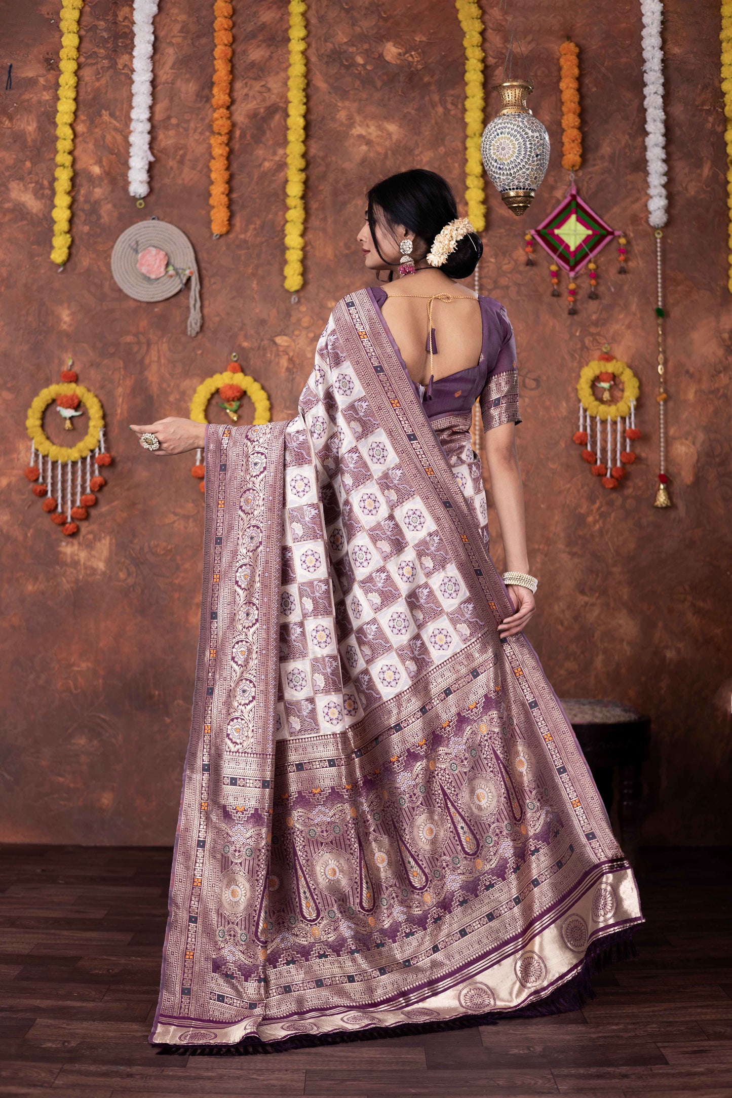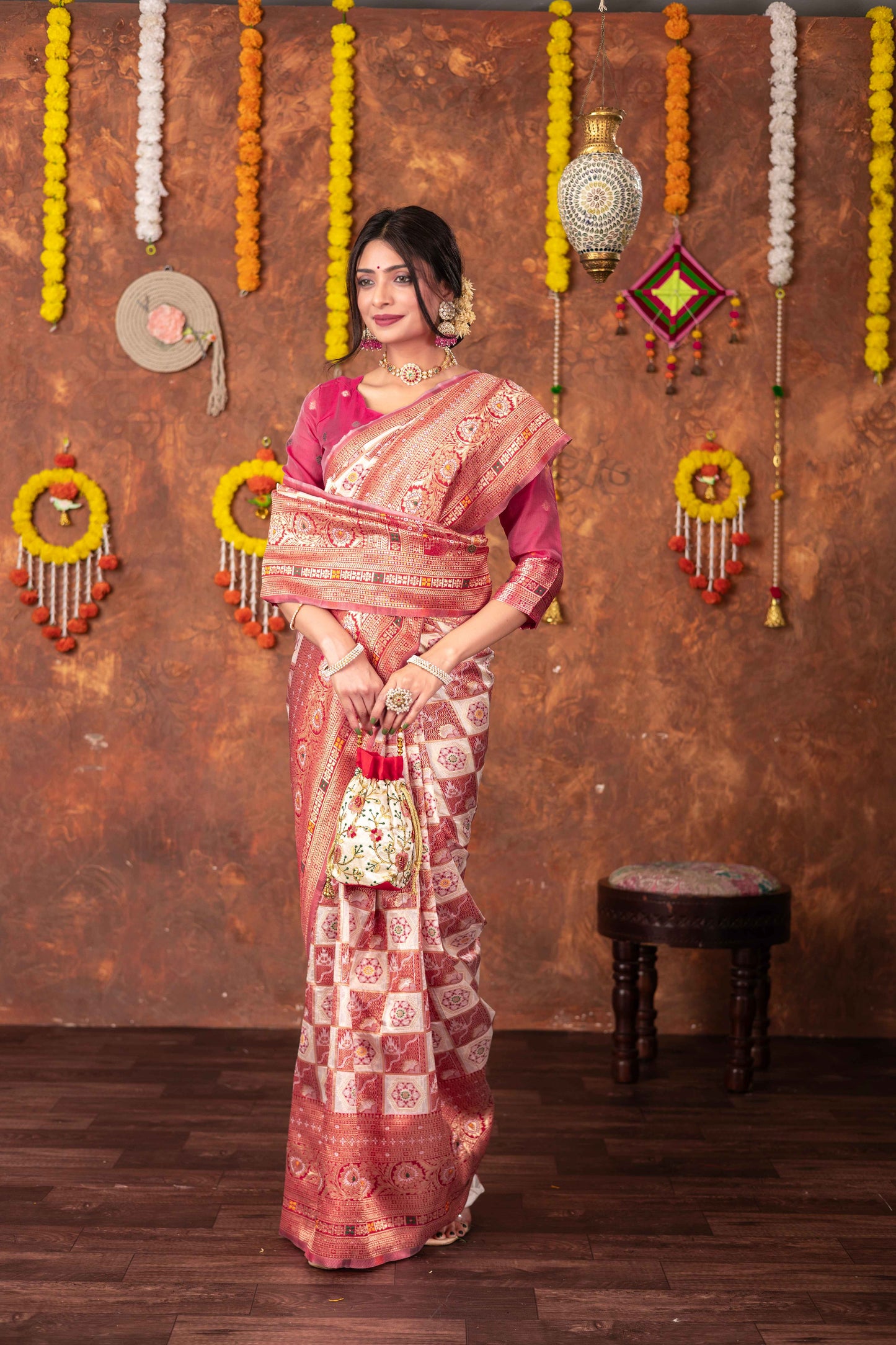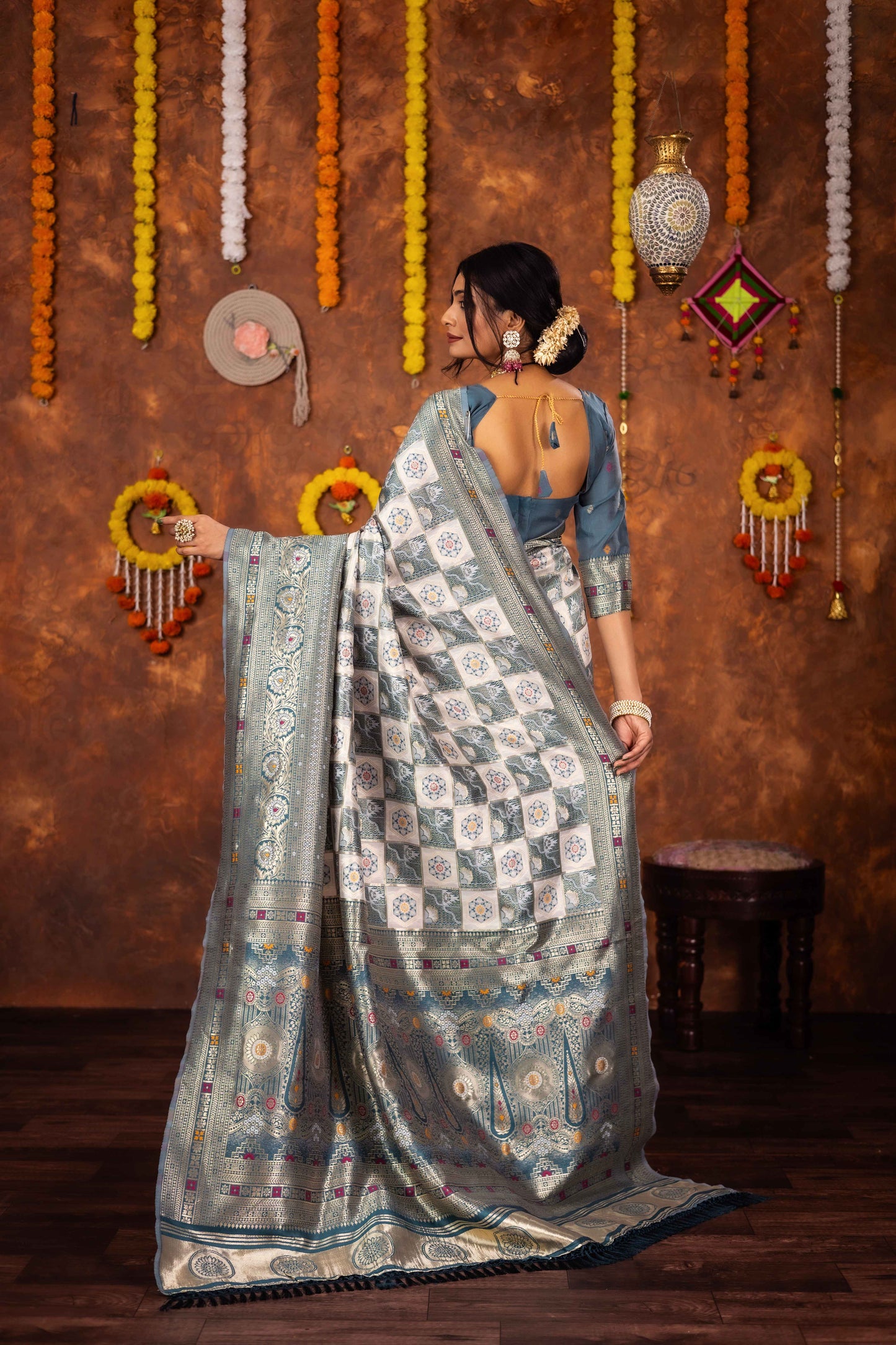 Step into timeless tradition with this exquisite Patola Silk Saree, beautifully woven with classic geometric and floral motifs. Featuring a harmonious blend of ivory, this saree brings together heritage aesthetics with refined craftsmanship, making it ideal for festive celebrations, weddings, and special cultural occasions.